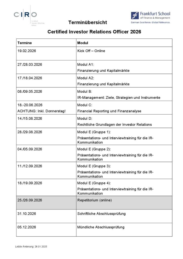 Das Weiterbildungsprogramm CIRO wurde in Zusammenarbeit mit kompetenten und erfahrenen Spezialisten entwickelt. Im Mittelpunkt steht die Vermittlung eines breit angelegten Basis-Wissens, das nach bestandener Abschlussprüfung durch die Verleihung des CIRO-Zertifikats testiert wird. Der berufsbegleitende Studiengang ist modular aufgebaut und wird in Zusammenarbeit mit der Frankfurt School of Finance & Management in Frankfurt am Main durchgeführt. Der CIRO ist als Veranstaltung der beruflichen Weiterbildung anerkannt.