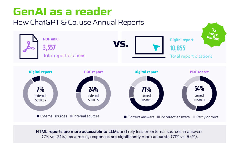 Hinzu kommen praktische Vorteile: Etwa die geringe Verarbeitungskomplexität (HTML kann direkt und besonders schnell geparst werden. Aber auch die Verlinkung auf eine spezifische HTML-Website (z. B. die Gewinn- und Verlustrechnung) ist deutlich einfacher, als auf ein 300-seitiges PDF-Dokument. HTML-Berichte können zudem mittels Generative Engine Optimization (GEO) gezielt für LLMs optimiert werden.
