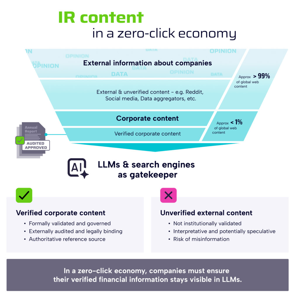 Die Zero-Click Economy wird häufig als ein zentraler Paradigmenwechsel in der Informationsnutzung beschrieben. Sie steht sinnbildlich für den voranschreitenden Trend, dass Nutzer (und damit auch Stakeholder) ihre Inhalte nicht mehr aus den digitalen Angeboten von Unternehmen direkt, sondern aus den Antworten von Suchmaschinen oder LLMs wie ChatGPT erhalten. In einer „Zero-Click Economy“ erhalten Nutzer folglich Antworten direkt aus Suchmaschinen oder KI-Systemen, ohne die ursprünglichen Websites zu besuchen. In der Konsequenz heißt das: die tatsächliche Nutzung von Investor Relations Websites, IR-Präsentationen und anderen Inhalten wird tendenziell zurückgehen. Allerdings ist das nur die halbe Wahrheit – denn betroffen sind hier vor allem die direkten Zugriffe auf IR-Inhalte durch menschliche User: Zeitgleich wächst nämlich die Bedeutung von originären Unternehmensinformationen als Quelle für Maschinen – etwa die Crawler von ChatGPT. Börsennotierte Konzerne und IROs müssen ihre Finanz- und Unternehmensinformationen deshalb jetzt und in Zukunft möglichst zugänglich für LLMs machen – und genau hier ist HTML als Format gegenüber PDFs deutlich im Vorteil: