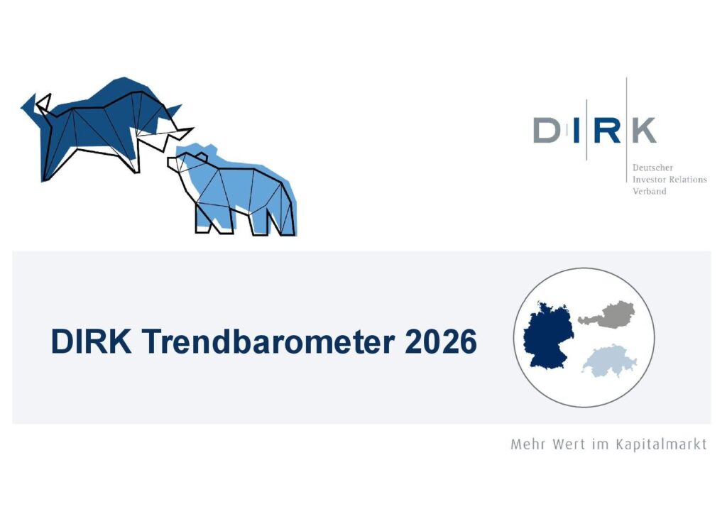 Seit Jahren prägen volatile Märkte, geopolitische Spannungen und Konjunktursorgen das Umfeld – Verlässlichkeit ist rar, langfristige Prognosen sind so gut wie unmöglich. Das aktuelle Trendbarometer des DIRK – Deutscher Investor Relations Verband zeigt, dass Investor-Relations-Verantwortliche einen kühlen Kopf bewahren und die gesamtwirtschaftliche Lage realistisch einschätzen, mit Blick auf die zukünftige Entwicklung jedoch etwas zuversichtlicher und positiver gestimmt sind.
