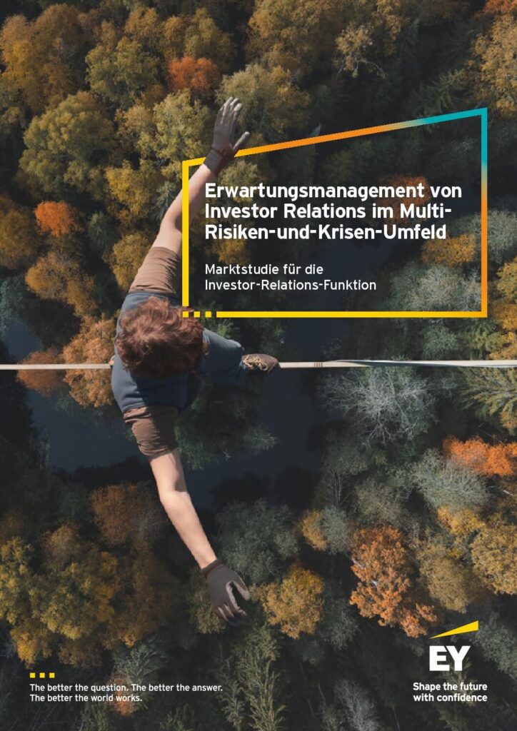 Die gemeinsame Studie von EY und dem DIRK „Erwartungsmanagement von Investor Relations im Multi-Risiken-und Krisen-Umfeld“ beschäftigt sich deshalb mit diesen Fragen: Wie bereitet sich IR auf den Multi-Risiken-und-Krisen-Modus vor? Was sind neue Anforderungen an das Risikomanagement, die Corporate Governance, die Krisenkommunikation, an das Erwartungsmanagement und an die Organisation der IR-Funktion?