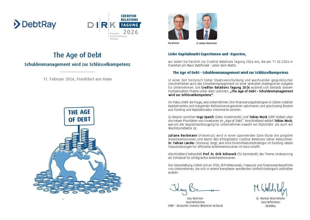 Die Tagung ist eine gemeinsame Veranstaltung von DIRK – Deutscher Investor Relations Verband und DebtRay, mit freundlicher Unterstützung von S&P Global. Sie bietet einen kompakten Überblick über aktuelle Entwicklungen, Best Practices und Strategien im professionellen Umgang mit Unternehmensschulden und Finanzierungsstrukturen.
